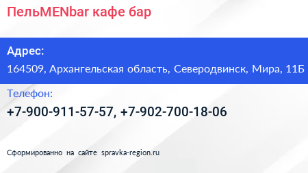 ПельMENbar, кафе-бар по адресу 164509, Архангельская область, Северодвинск, Мира, 11Б в дальнейшем Организация, размещена в следующих категориях: