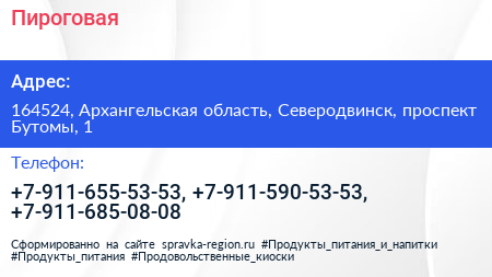 Пироговая по адресу 164524, Архангельская область, Северодвинск, проспект Бутомы, 1 в дальнейшем Организация, размещена в следующих категориях: