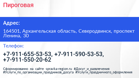 Пироговая по адресу 164501, Архангельская область, Северодвинск, проспект Ленина, 30 в дальнейшем Организация, размещена в следующих категориях: