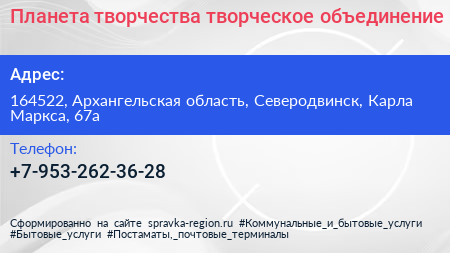 Планета творчества, творческое объединение по адресу 164522, Архангельская область, Северодвинск, Карла Маркса, 67а в дальнейшем Организация, размещена в следующих категориях: