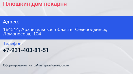 Плюшкин дом, пекарня по адресу 164514, Архангельская область, Северодвинск, Ломоносова, 104 в дальнейшем Организация, размещена в следующих категориях:
