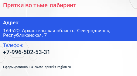 Прятки во тьме, лабиринт по адресу 164520, Архангельская область, Северодвинск, Республиканская, 7 в дальнейшем Организация, размещена в следующих категориях: