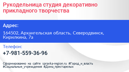 Рукодельница, студия декоративно-прикладного творчества по адресу 164502, Архангельская область, Северодвинск, Кирилкина, 7а в дальнейшем Организация, размещена в следующих категориях: