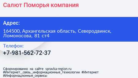 Салют Поморья, компания по адресу 164500, Архангельская область, Северодвинск, Ломоносова, 81 ст4 в дальнейшем Организация, размещена в следующих категориях: