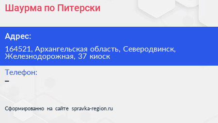 Шаурма по-Питерски по адресу 164521, Архангельская область, Северодвинск, Железнодорожная, 37 киоск в дальнейшем Организация, размещена в следующих категориях: