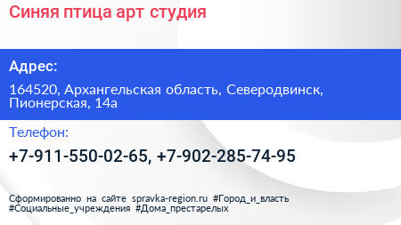 Синяя птица, арт-студия по адресу 164520, Архангельская область, Северодвинск, Пионерская, 14а в дальнейшем Организация, размещена в следующих категориях: