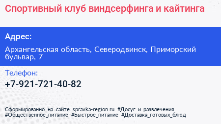 Спортивный клуб виндсерфинга и кайтинга по адресу Архангельская область, Северодвинск, Приморский бульвар, 7 в дальнейшем Организация, размещена в следующих категориях: