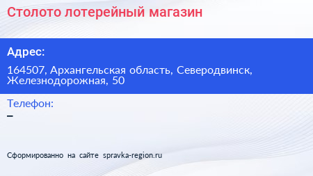 Столото, лотерейный магазин по адресу 164507, Архангельская область, Северодвинск, Железнодорожная, 50 в дальнейшем Организация, размещена в следующих категориях: