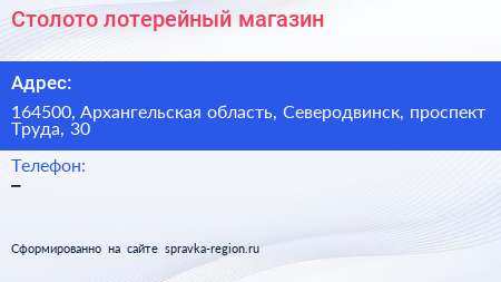 Столото, лотерейный магазин по адресу 164500, Архангельская область, Северодвинск, проспект Труда, 30 в дальнейшем Организация, размещена в следующих категориях: