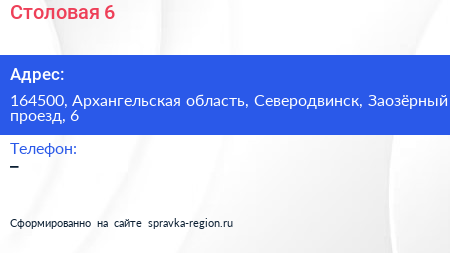 Столовая №6 по адресу 164500, Архангельская область, Северодвинск, Заозёрный проезд, 6 в дальнейшем Организация, размещена в следующих категориях: