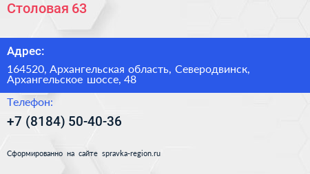Столовая №63 по адресу 164520, Архангельская область, Северодвинск, Архангельское шоссе, 48 в дальнейшем Организация, размещена в следующих категориях: