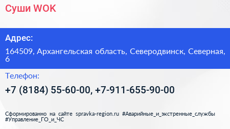 Суши WOK по адресу 164509, Архангельская область, Северодвинск, Северная, 6 в дальнейшем Организация, размещена в следующих категориях: