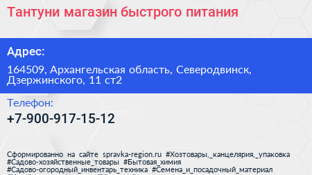 Тантуни, магазин быстрого питания по адресу 164509, Архангельская область, Северодвинск, Дзержинского, 11 ст2 в дальнейшем Организация, размещена в следующих категориях: