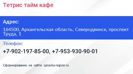 Тетрис, тайм-кафе по адресу 164500, Архангельская область, Северодвинск, проспект Труда, 1 в дальнейшем Организация, размещена в следующих категориях: