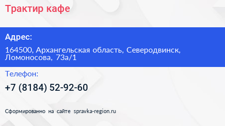 Трактир, кафе по адресу 164500, Архангельская область, Северодвинск, Ломоносова, 73а/1 в дальнейшем Организация, размещена в следующих категориях:
