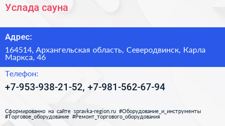 Услада, сауна по адресу 164514, Архангельская область, Северодвинск, Карла Маркса, 46 в дальнейшем Организация, размещена в следующих категориях: