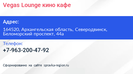 Vegas Lounge, кино-кафе по адресу 164520, Архангельская область, Северодвинск, Беломорский проспект, 44а в дальнейшем Организация, размещена в следующих категориях: