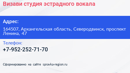 Визави, студия эстрадного вокала по адресу 164507, Архангельская область, Северодвинск, проспект Ленина, 47 в дальнейшем Организация, размещена в следующих категориях:
