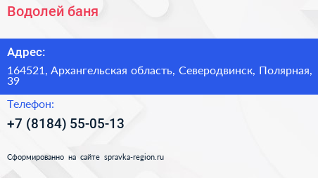 Водолей, баня по адресу 164521, Архангельская область, Северодвинск, Полярная, 39 в дальнейшем Организация, размещена в следующих категориях: