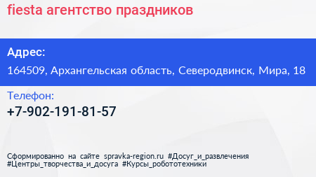 fiesta, агентство праздников по адресу 164509, Архангельская область, Северодвинск, Мира, 18 в дальнейшем Организация, размещена в следующих категориях: