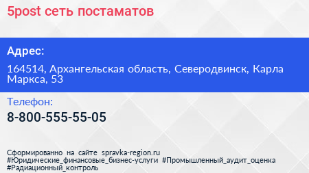 5post, сеть постаматов по адресу 164514, Архангельская область, Северодвинск, Карла Маркса, 53 в дальнейшем Организация, размещена в следующих категориях: