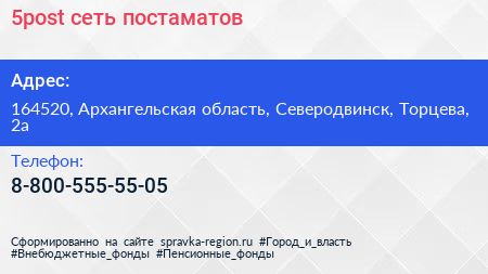 5post, сеть постаматов по адресу 164520, Архангельская область, Северодвинск, Торцева, 2а в дальнейшем Организация, размещена в следующих категориях: