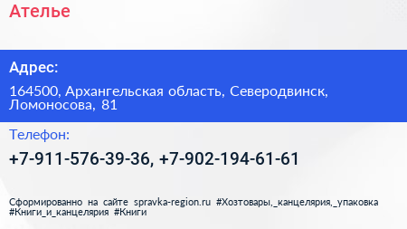 Ателье по адресу 164500, Архангельская область, Северодвинск, Ломоносова, 81 в дальнейшем Организация, размещена в следующих категориях: