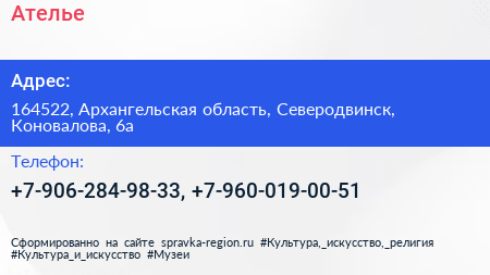 Ателье по адресу 164522, Архангельская область, Северодвинск, Коновалова, 6а в дальнейшем Организация, размещена в следующих категориях: