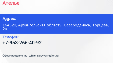 Ателье по адресу 164520, Архангельская область, Северодвинск, Торцева, 2в в дальнейшем Организация, размещена в следующих категориях: