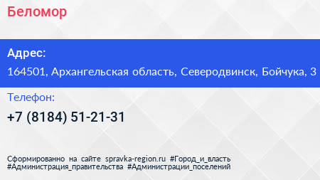 Беломор по адресу 164501, Архангельская область, Северодвинск, Бойчука, 3 в дальнейшем Организация, размещена в следующих категориях: