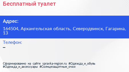 Бесплатный туалет по адресу 164504, Архангельская область, Северодвинск, Гагарина, 13 в дальнейшем Организация, размещена в следующих категориях: