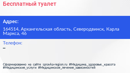 Бесплатный туалет по адресу 164514, Архангельская область, Северодвинск, Карла Маркса, 46 в дальнейшем Организация, размещена в следующих категориях: