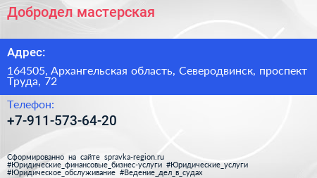 Добродел, мастерская по адресу 164505, Архангельская область, Северодвинск, проспект Труда, 72 в дальнейшем Организация, размещена в следующих категориях: