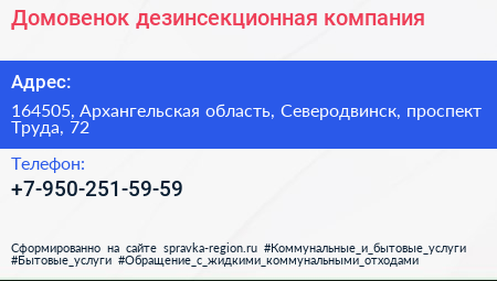 Домовенок, дезинсекционная компания по адресу 164505, Архангельская область, Северодвинск, проспект Труда, 72 в дальнейшем Организация, размещена в следующих категориях: