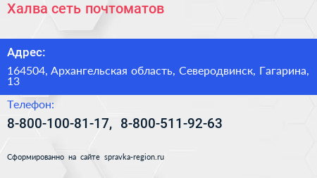 Халва, сеть почтоматов по адресу 164504, Архангельская область, Северодвинск, Гагарина, 13 в дальнейшем Организация, размещена в следующих категориях: