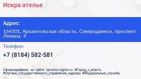 Искра, ателье по адресу 164501, Архангельская область, Северодвинск, проспект Ленина, 4 в дальнейшем Организация, размещена в следующих категориях: