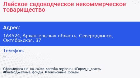 Лайское, садоводческое некоммерческое товарищество по адресу 164524, Архангельская область, Северодвинск, Октябрьская, 37 в дальнейшем Организация, размещена в следующих категориях: