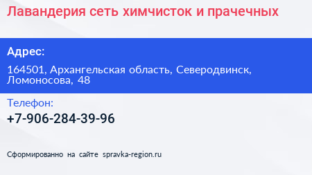 Лавандерия, сеть химчисток и прачечных по адресу 164501, Архангельская область, Северодвинск, Ломоносова, 48 в дальнейшем Организация, размещена в следующих категориях: