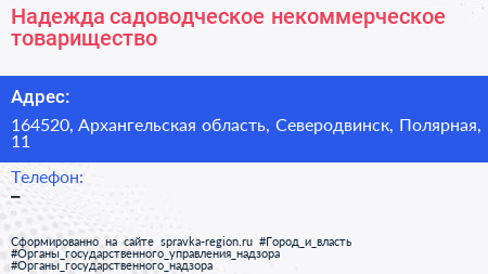 Надежда, садоводческое некоммерческое товарищество по адресу 164520, Архангельская область, Северодвинск, Полярная, 11 в дальнейшем Организация, размещена в следующих категориях: