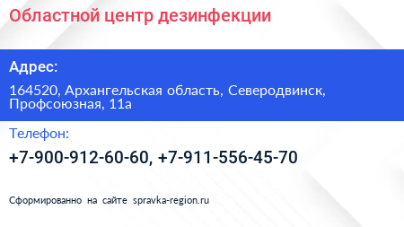 Областной центр дезинфекции по адресу 164520, Архангельская область, Северодвинск, Профсоюзная, 11а в дальнейшем Организация, размещена в следующих категориях:
