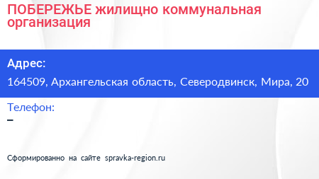 ПОБЕРЕЖЬЕ, жилищно-коммунальная организация по адресу 164509, Архангельская область, Северодвинск, Мира, 20 в дальнейшем Организация, размещена в следующих категориях: