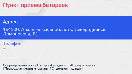 Пункт приема батареек по адресу 164500, Архангельская область, Северодвинск, Ломоносова, 81 в дальнейшем Организация, размещена в следующих категориях: