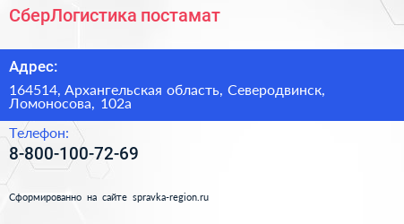 СберЛогистика, постамат по адресу 164514, Архангельская область, Северодвинск, Ломоносова, 102а в дальнейшем Организация, размещена в следующих категориях: