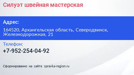 Силуэт, швейная мастерская по адресу 164520, Архангельская область, Северодвинск, Железнодорожная, 21 в дальнейшем Организация, размещена в следующих категориях: