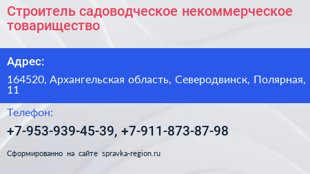 Строитель, садоводческое некоммерческое товарищество по адресу 164520, Архангельская область, Северодвинск, Полярная, 11 в дальнейшем Организация, размещена в следующих категориях: