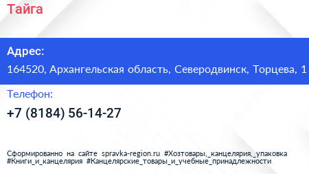 Тайга по адресу 164520, Архангельская область, Северодвинск, Торцева, 1 в дальнейшем Организация, размещена в следующих категориях: