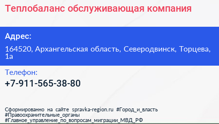 Теплобаланс, обслуживающая компания по адресу 164520, Архангельская область, Северодвинск, Торцева, 1а в дальнейшем Организация, размещена в следующих категориях: