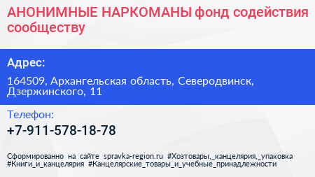АНОНИМНЫЕ НАРКОМАНЫ, фонд содействия сообществу по адресу 164509, Архангельская область, Северодвинск, Дзержинского, 11 в дальнейшем Организация, размещена в следующих категориях: