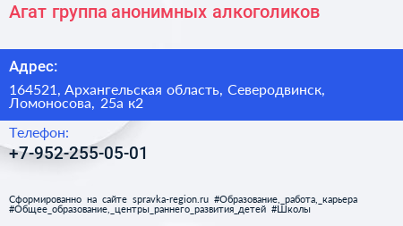 Агат, группа анонимных алкоголиков по адресу 164521, Архангельская область, Северодвинск, Ломоносова, 25а к2 в дальнейшем Организация, размещена в следующих категориях: