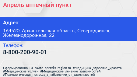 Апрель, аптечный пункт по адресу 164520, Архангельская область, Северодвинск, Железнодорожная, 22 в дальнейшем Организация, размещена в следующих категориях: